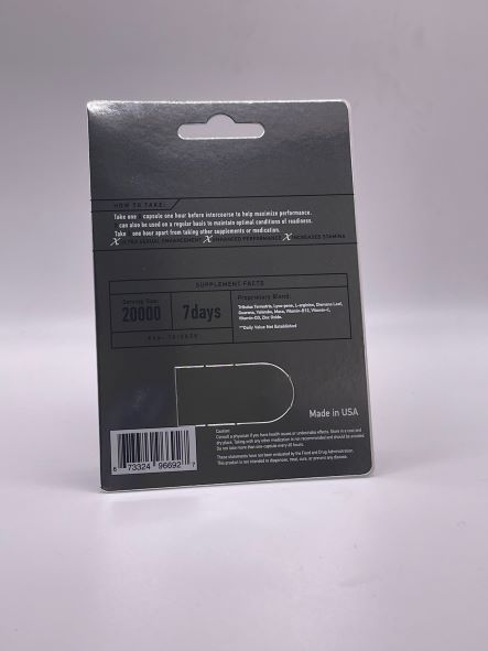 X Enhancement Pill 20 Count Display. X Enhancement Pill for male sexual enhancement. How to take: take one capsule one hour before intercourse to help maximize performance. Can also be used on a regular bases to maintain optimal conditions of readiness. Take one hour apart from taking other supplements or medications. Ingredients: Tribulus Terrestrus, Lycepene, L-Arginine, Diamana Leaf, Guarana, Yohimbe, Maca, Vitamin B12, Vitamin C, Vitamin D3, Zinc Oxide. X Ultra sexual enhancement. Enhanced performance. Increased stamina. Warnings, cautions: consult a physician if you have health issues or undesirable effects. Store in a cool, dry place, or taking with other medication. It is not recommended and should be avoided. Do not take more than one capsule every 60 hours. These statements have not been evaluated by the Food and Drug administration. This product is not intended to diagnose, treat, cure or prevent any disease. Daily value not established. Categories: Meds, Supplements, Sex Pills, Sex Toys for Men, Health and Beauty Aids. Made in the USA. 2024.