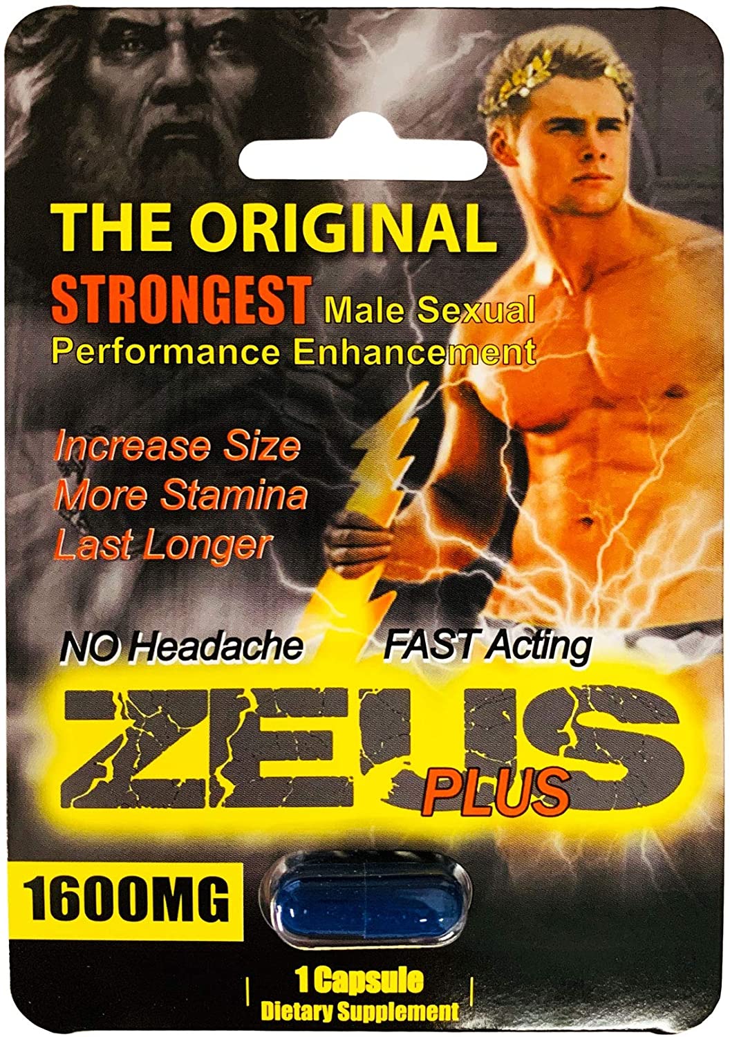 Zeus Plus Male Enhancement 25 Packages Display 1 Capsule for men dietary supplement. The original strongest male sexual performance. Increase size. More stamina. Last longer. No headache. Fast acting Ultimate Male Enhancer is an herbal supplement developed to help boost sexual pleasure and improve sexual performance. Take one capsule of this complete herbal supplement approximately 45 minutes prior to sexual activity and approximately 2 hours after eating. For best results do not take on an empty stomach, but do not take with food. Zeus contains natural ingredients, such as Tribulus, Condyceps Militaris, Ginger root, Cnidimum, Monnier Extract, Theobroine, Rhodiola as well as other natural roots and herbs. These statements have not been evaluate by the Food and Drug Administion. This product is not intended diagnose, treat, cure or prevent any disease.